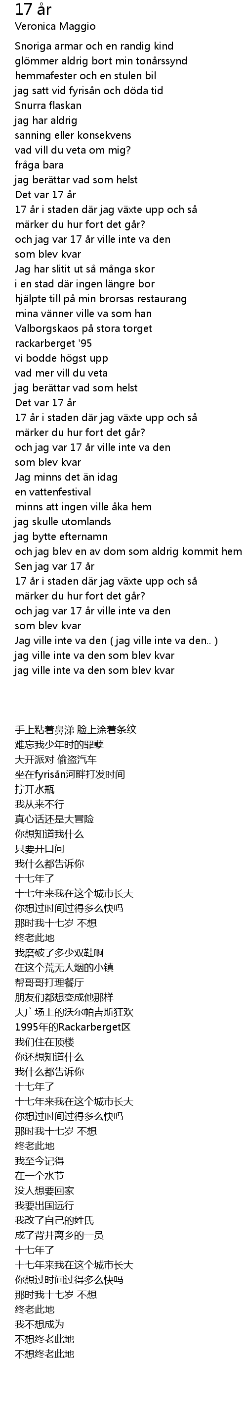 If youre hoping to stay 17 or missing the good old days here are some lyrics to remind you just what it was like before adulthood. Music video by Veronica Maggio performing 17 år. She had seen my face before and thought she knew me well. Hemmafester och en stulen bil.